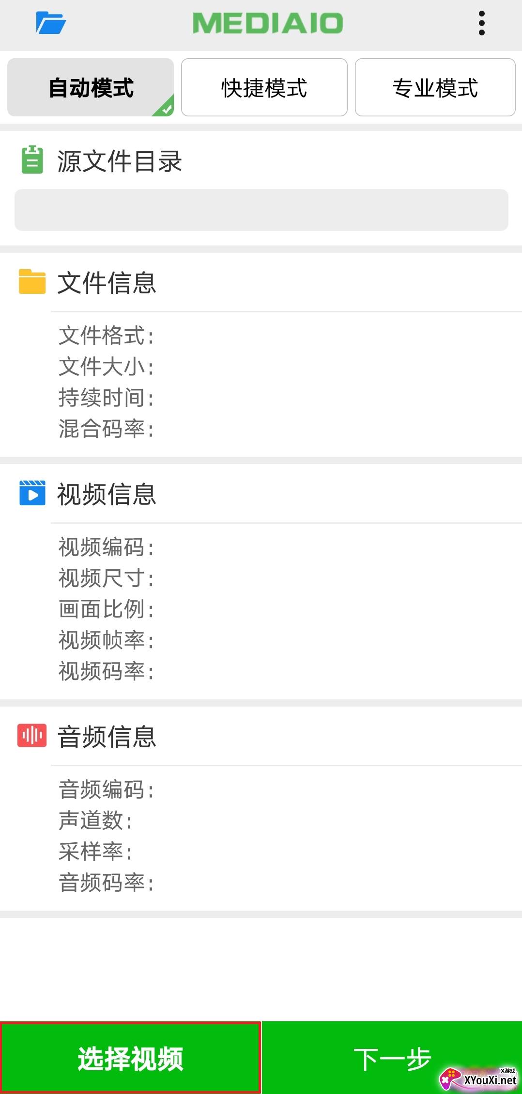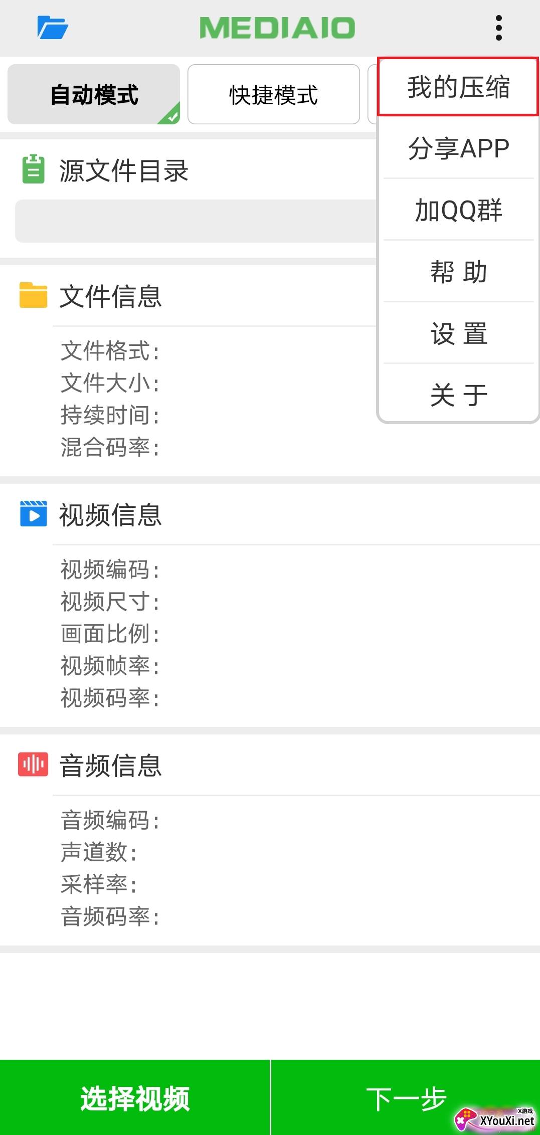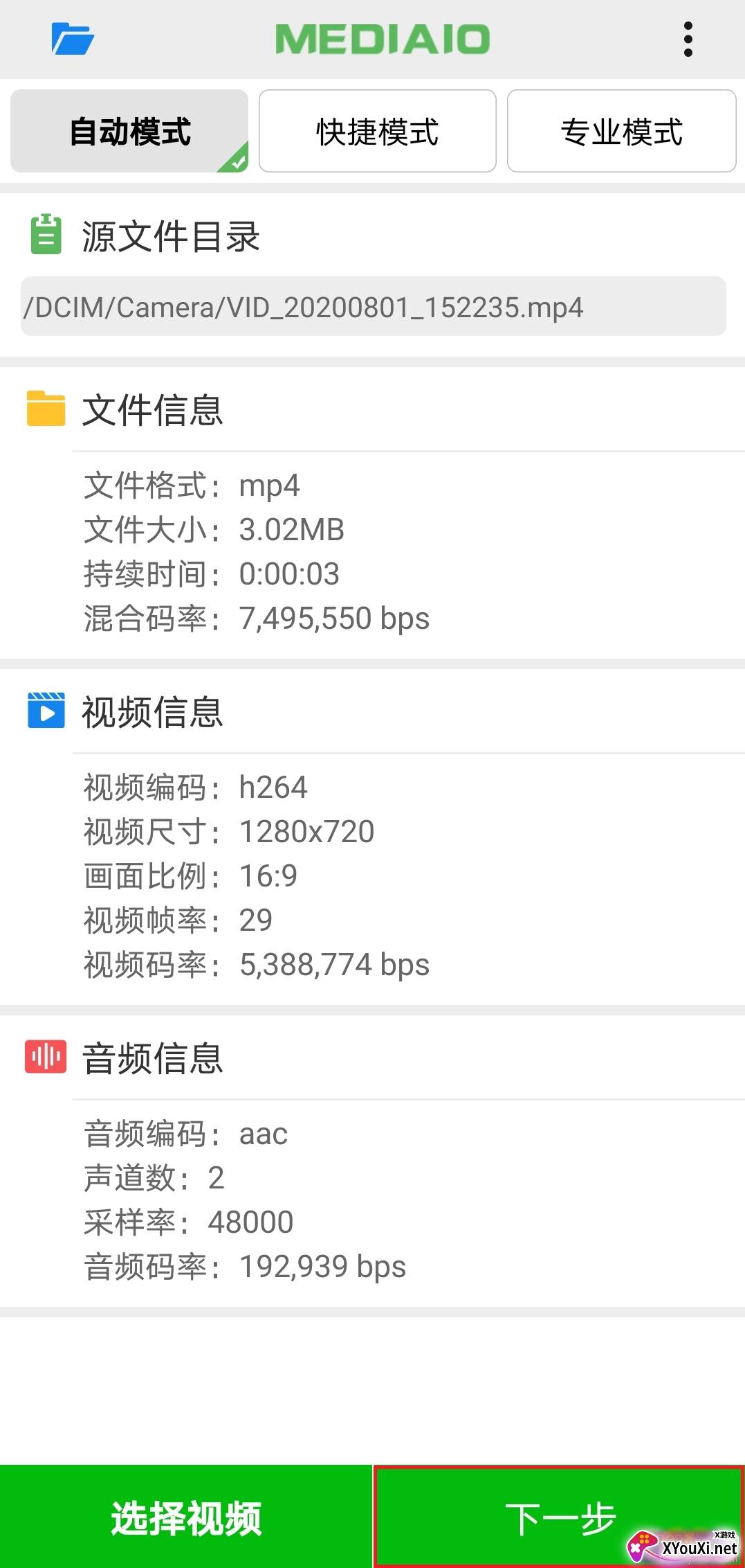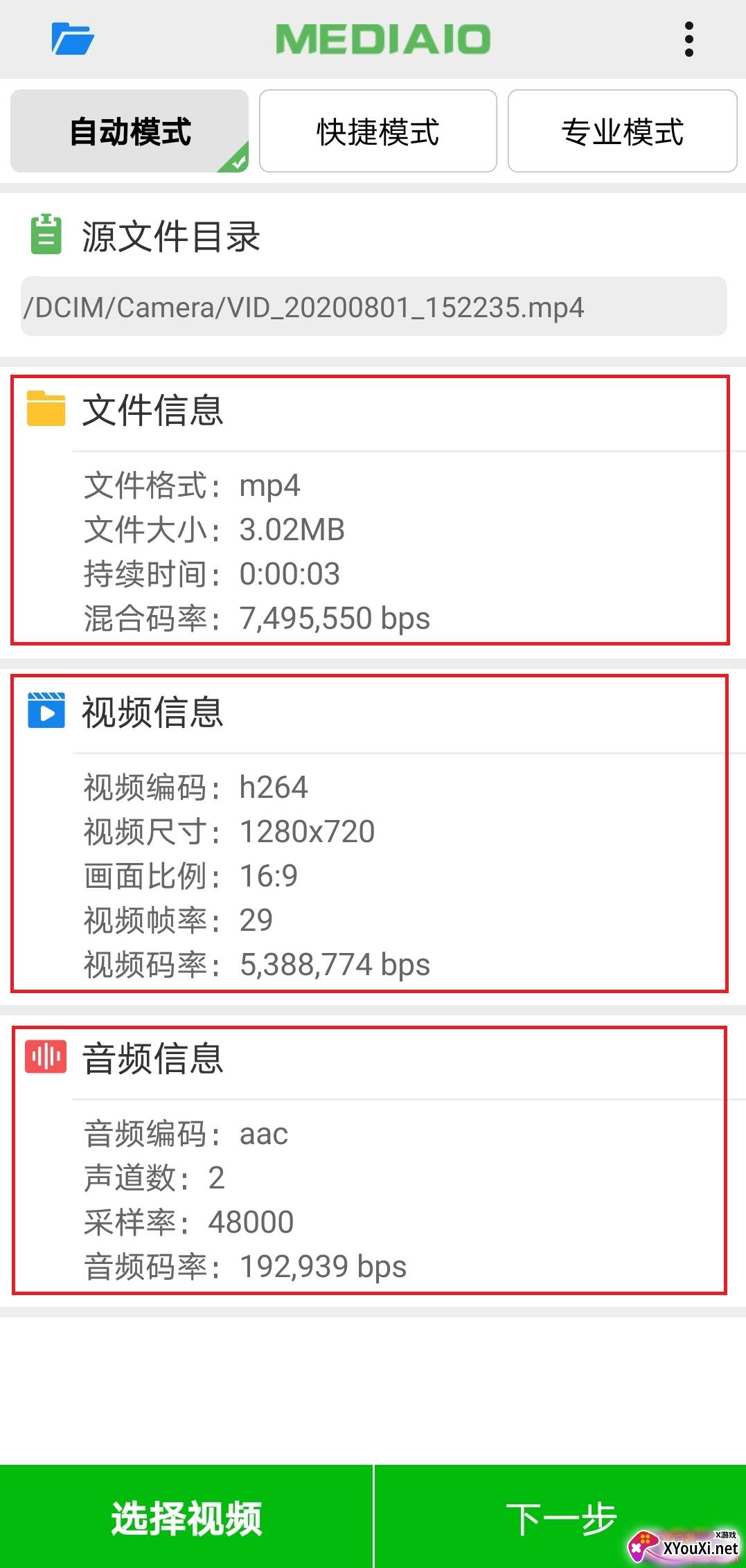 点击“选择视频”,手机相册随即展现。选择您想要压缩的视频,App将智能解析视频的所有信息,包括文件、视频和音频详情。
