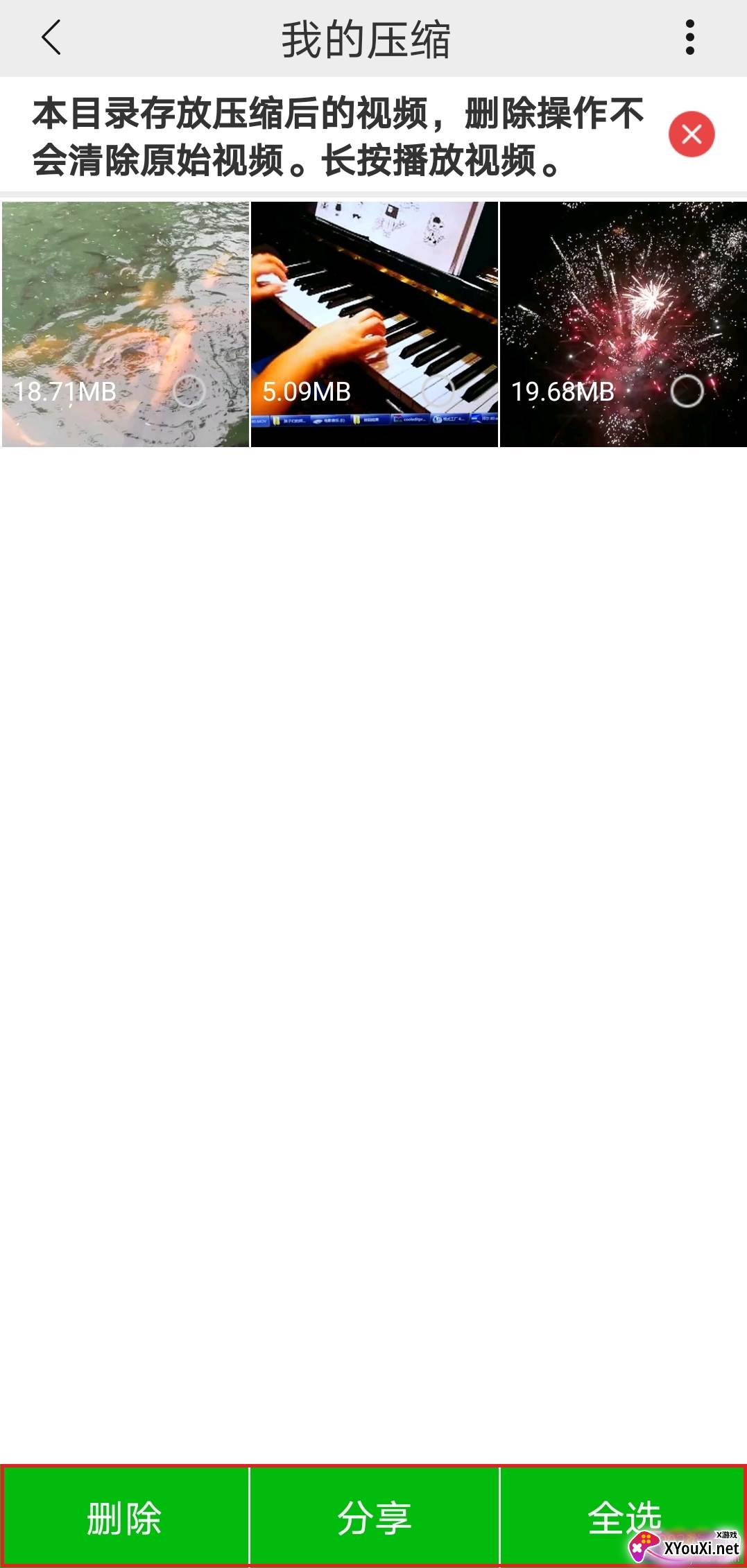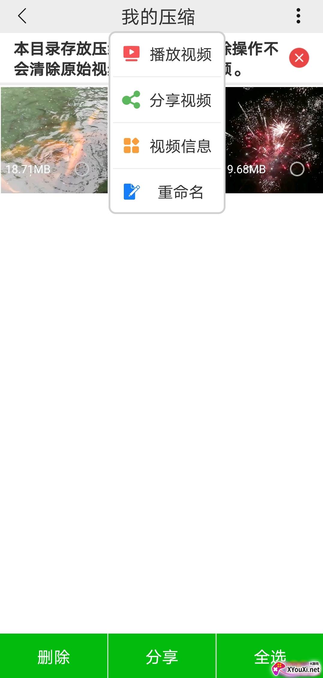 在“我的压缩”页面,您可以方便地进行删除、分享、全选等操作,管理您的视频库。