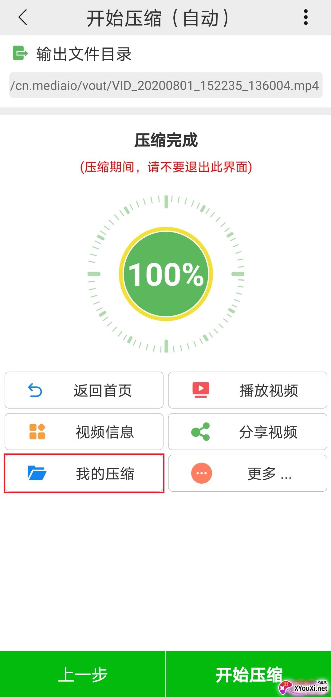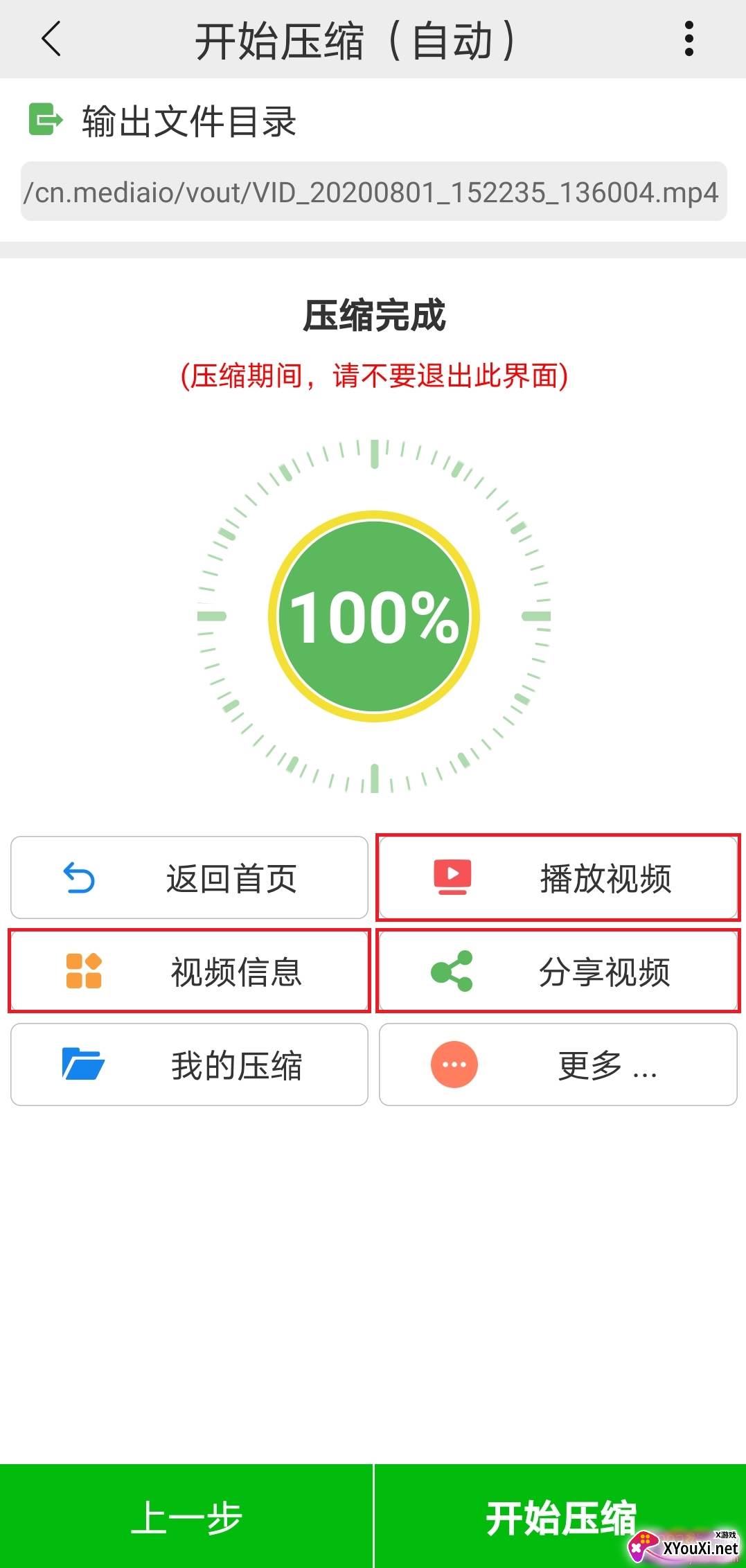 7. 压缩后操作便捷:压缩完成后,支持视频播放、信息查看及分享。