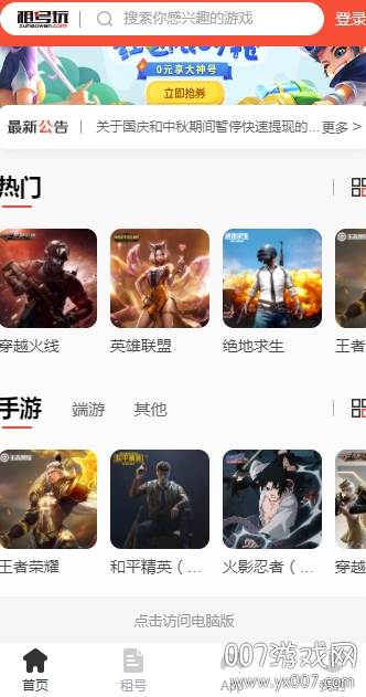 1、APP主界面清晰展示了热门游戏账号租赁信息。