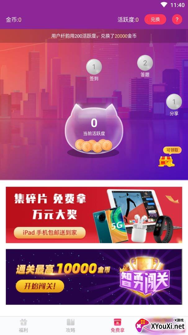 想要轻松赚取零花钱?快趣拿App福利版绝对是你的不二之选!这不仅是一个手机赚钱平台,更是一个充满乐趣的福利宝库。只需动动手指,参与答题、每日签到、浏览攻略,就能轻松积累活跃度,解锁各项丰厚福利。你的使用时间越长,用户等级越高,随之而来的权益也就越加丰厚!通过完成各种任务,你可以搜集金币,兑换琳琅满目的福利礼品。心动不如行动,立即下载,开启你的赚钱之旅吧!