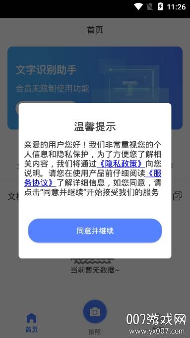 初次使用,请先进入软件,并同意用户协议与隐私政策。