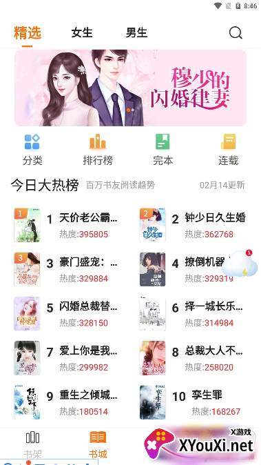 3、榜单精选,告别书荒: 女生榜、男生榜、人气榜、收藏榜,全方位为你推荐时下最热门的好书,让你一本接一本,欲罢不能。