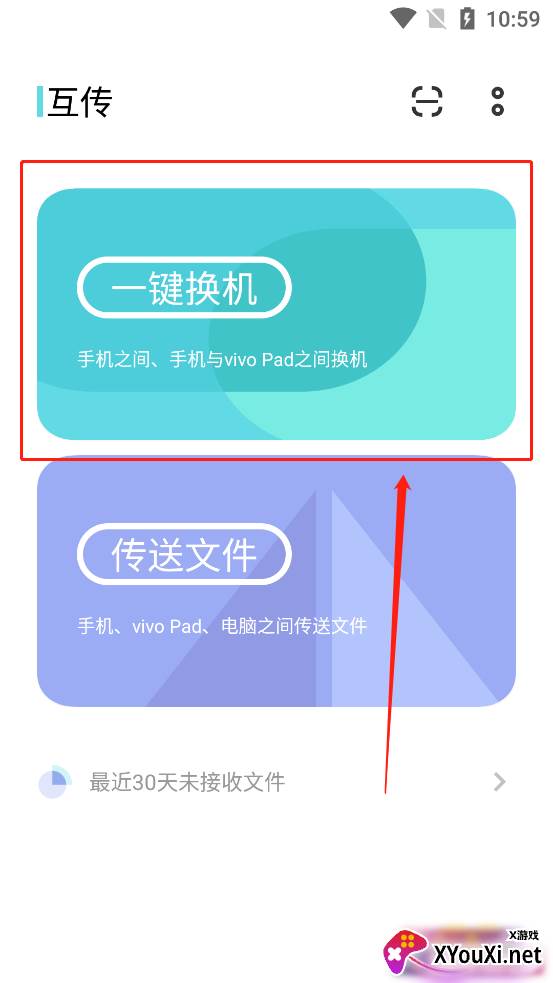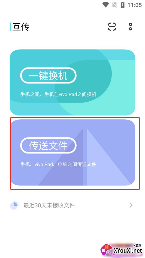 2. 另一台设备同样打开「互传」,选择“传输文件”,点击“我要接收”。