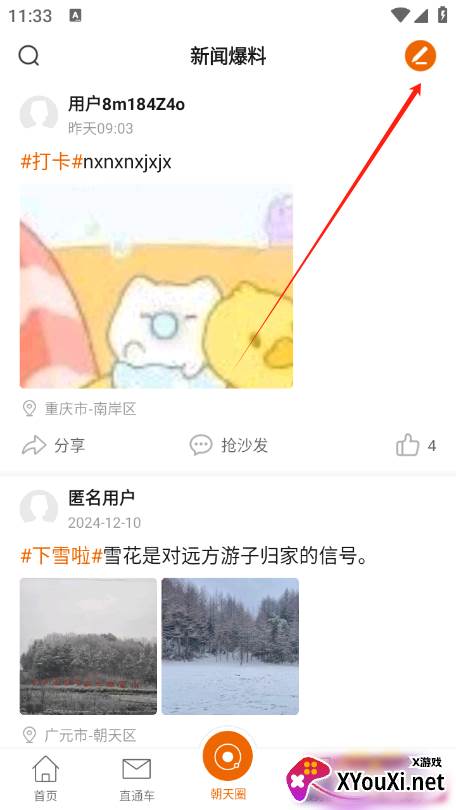 4. 互动社区,畅所欲言:点击“朝天圈”右上角的笔记图标,即可轻松发布您的动态,与网友们畅聊分享,构建属于您的朝天社交圈。