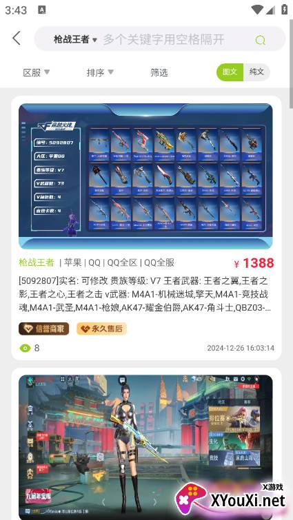 2. 启动App,你将沉浸在一个琳琅满目的游戏账号信息海洋,各类可交易的游戏账号尽收眼底。