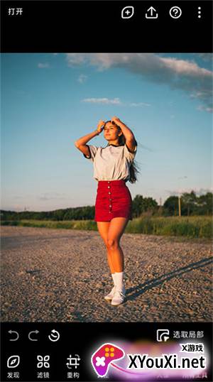 1. 启动 Polarr 修图应用,您会看到底部导航栏,包含“发现”、“滤镜”、“重构”、“调整”、“图层”、“人像”、“所有工具”以及“选取局部”等选项。根据您的编辑需求,随心选择。此处以“选取局部”为例进行演示。