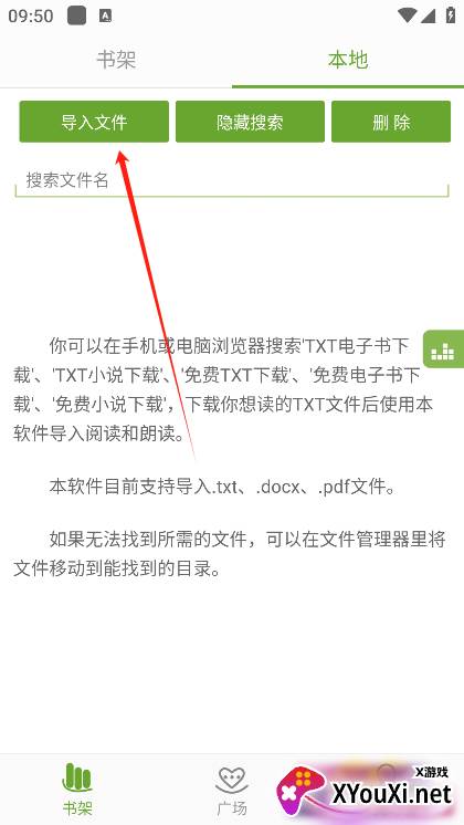 3. 在“书架”页面,您可以轻松导入本地存储的文本文件。
