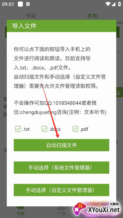 4. 选择“自动扫描文件”功能,即可快速发现并导入您手机上的TXT小说。