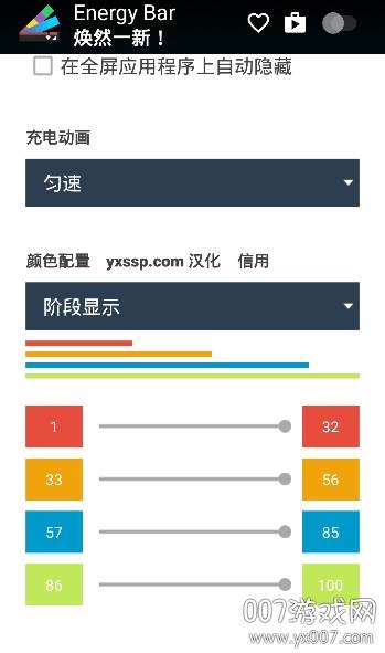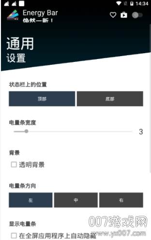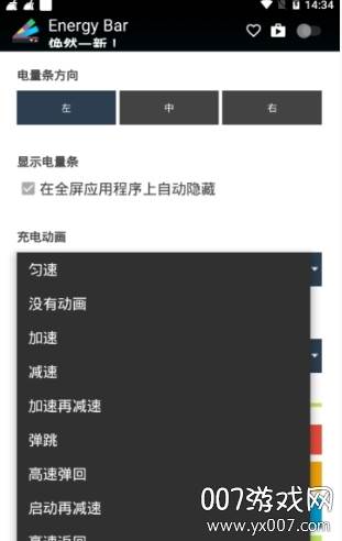 对于追求极致的你,这款软件提供了更多色彩上的可能性。电量条可以呈现出单一纯色、多色分段,甚至是流畅的渐变效果(专业版特供)。这意味着,你可以随心所欲地为你的电量条赋予任何你喜欢的色彩,让它成为你独特个性的延伸。别担心它会拖累手机性能,EnergyBar对CPU的占用几乎为零,它只会悄悄地在你电量变动时才苏醒,尽职尽责地更新显示。此外,电量条的起始位置也能由你掌控,无论是左对齐、居中还是右对齐,都能随你心意。当你在沉浸于全屏模式下的应用、视频、图片或游戏时,还可以选择隐藏电量条,避免任何干扰。