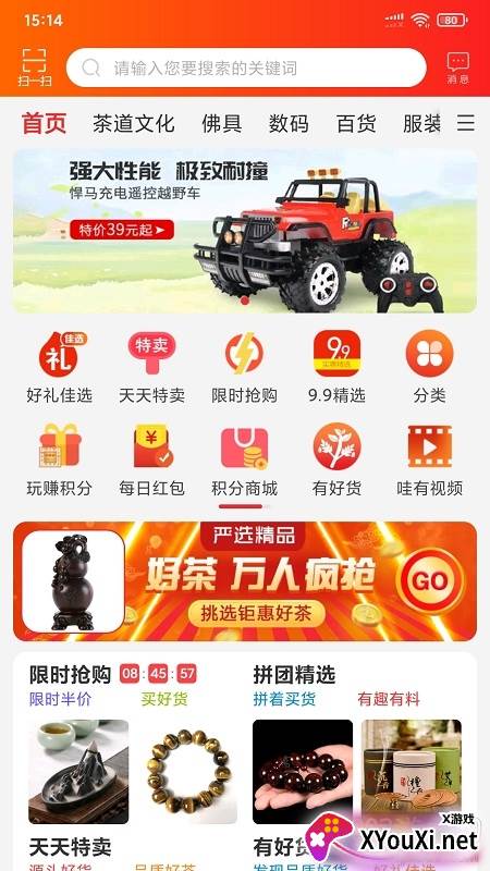 精选好礼、每日特卖、限时秒杀、9.9包邮专区、商品分类导航、趣味积分兑换。