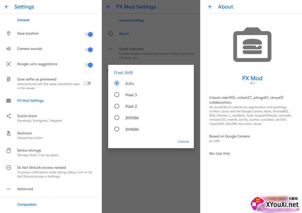 7. 新增AWB(自动白平衡)选择,支持Pixel 2、Pixel 3、IMX586、IMX686等多种传感器。