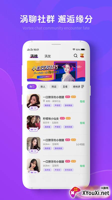 涡聊app是一款便捷易用的移动在线交友平台,汇聚了海量优质单身资源。在这里,您可以轻松与心仪的对象互动,快速发现身边的缘分。还在犹豫什么?快来下载,开启您的社交新篇章!