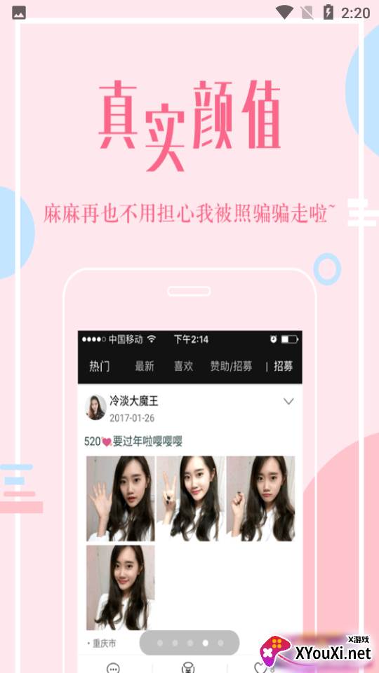 “高颜值”app实行系统+人工双重审核,每一位用户都是渴望脱单的真实个体。更有超过九成用户通过真人认证,让你聊天无忧,真心交友。