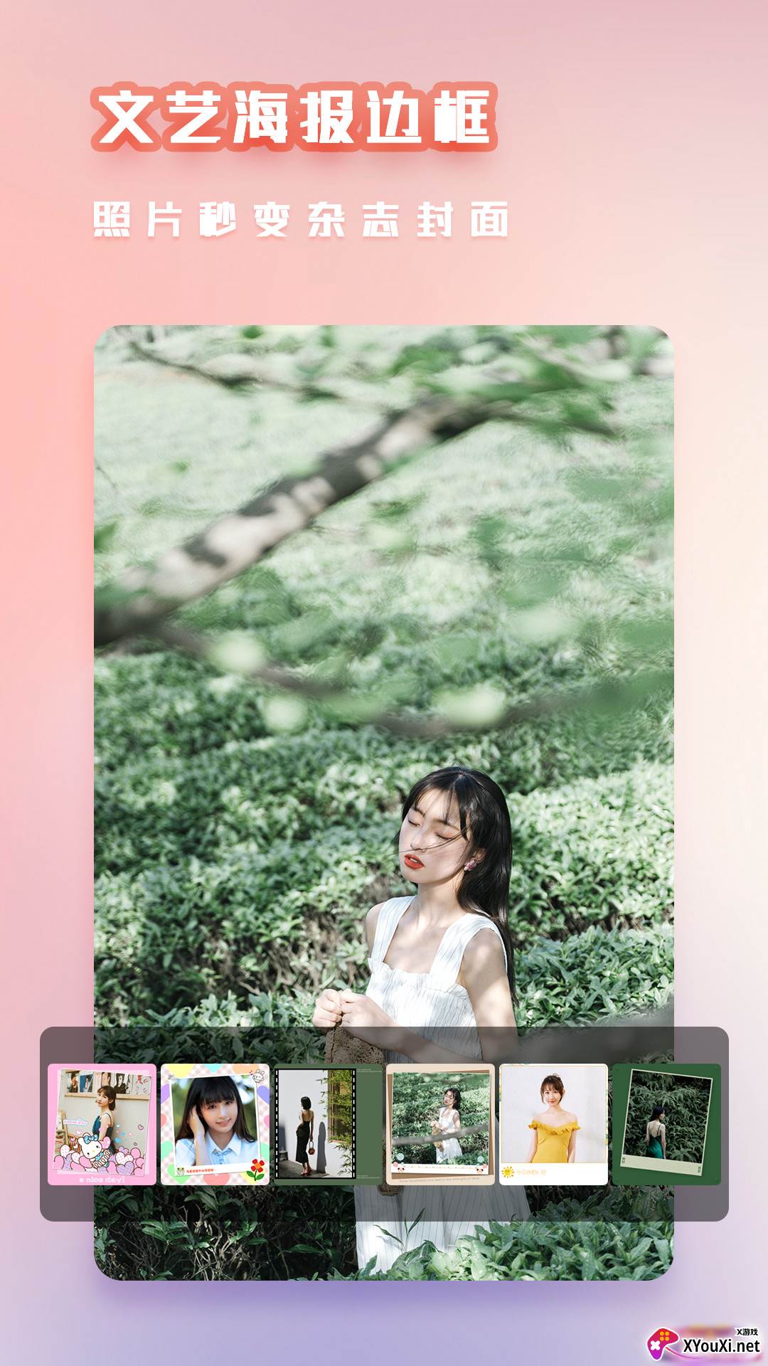 - 文艺边框,封面级呈现:为你的照片披上文艺范儿十足的海报边框,瞬间提升照片格调,让你的每一张自拍都仿佛登上杂志封面,吸睛力十足!