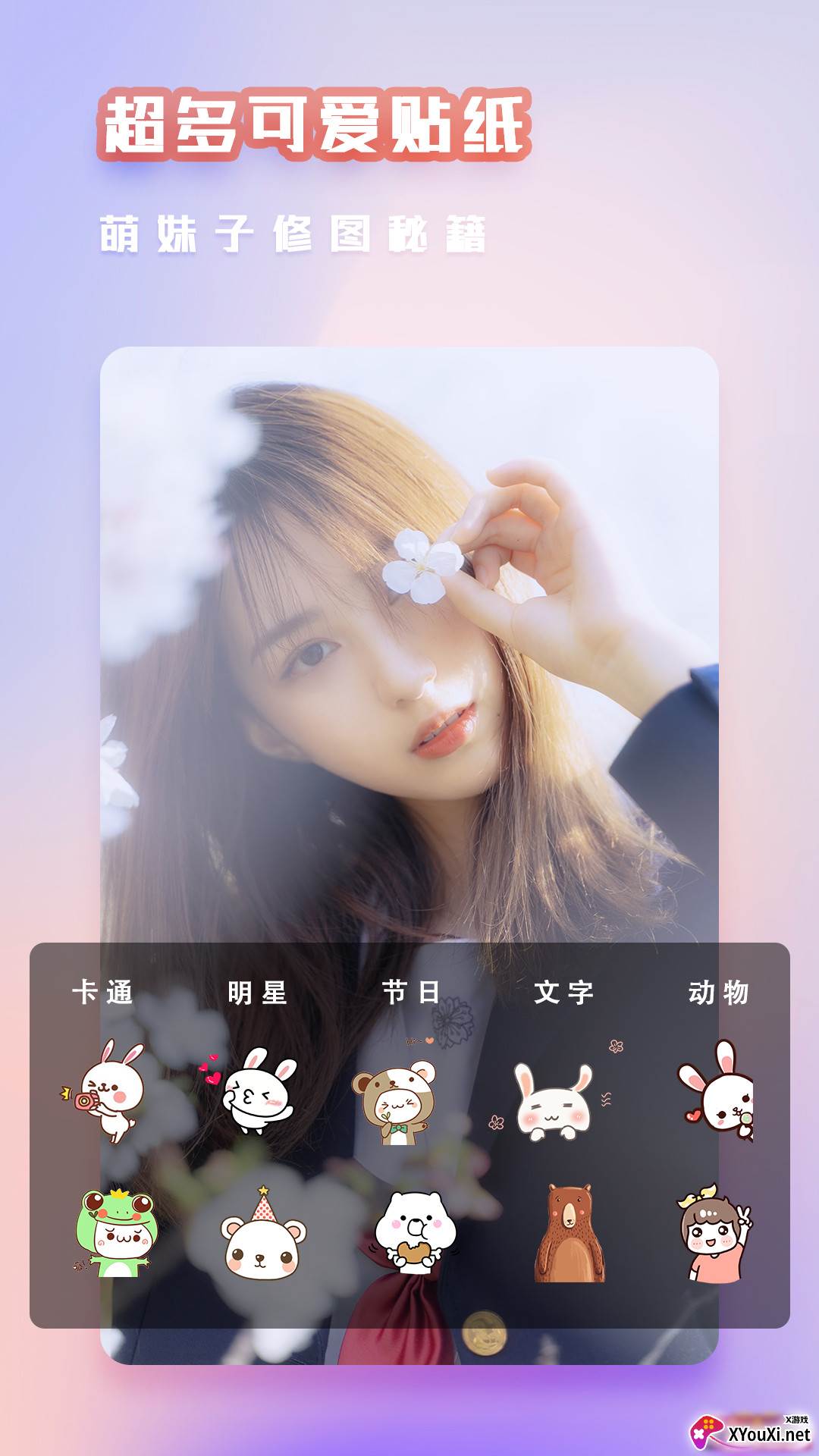 - 萌趣贴纸,点睛之笔:想要你的照片更添几分俏皮可爱?海量激萌贴纸库为你敞开,随心选择,自由添加,让你的美图瞬间萌力值飙升,可爱值满格!