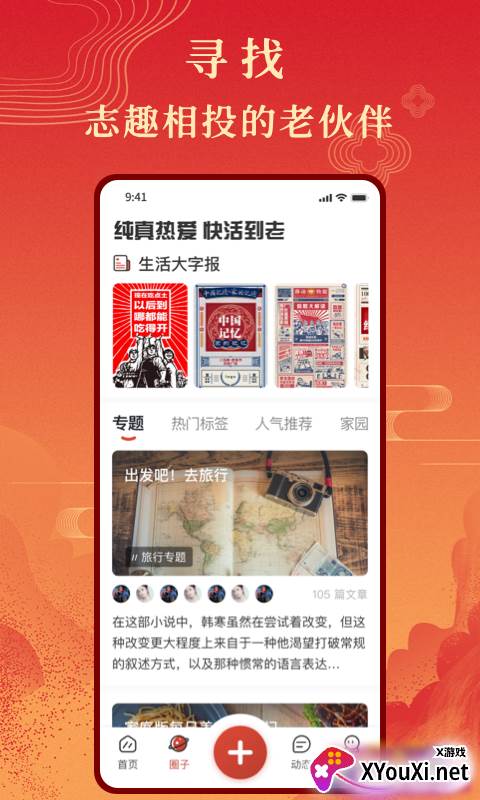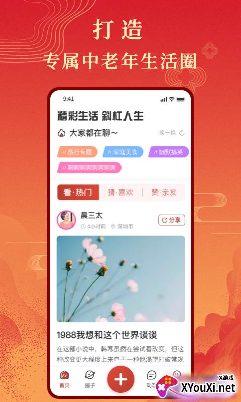这款贴心的社交软件,让中老年朋友们随时随地畅游网络世界。在这里,您能深刻体验到便捷交友的乐趣,与天南地北的“老伙伴”即时互动,感受实时在线交流带来的无限欢乐。更重要的是,您可以在动态广场自由分享生活中的每一个精彩瞬间,让流金岁月焕发新的光彩。