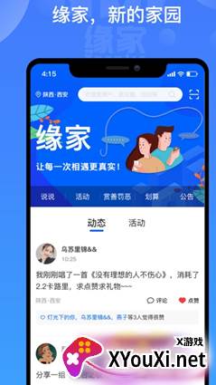 缘家app,一款焕新登场的手机社交利器,以社区交友为核心,为你敞开一扇探索精彩活动的大门。在这里,告别孤单,轻松结识志同道合的伙伴,点亮你的生活。还在犹豫什么?心动不如行动,快来下载安装,开启你的缘分之旅吧!