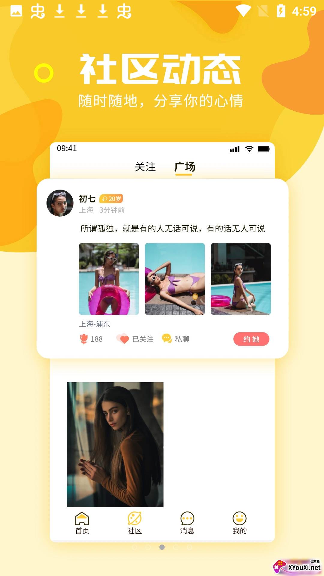 兴趣广场: 加入你热爱的圈子,与志同道合的同城伙伴不期而遇,从此告别孤单。