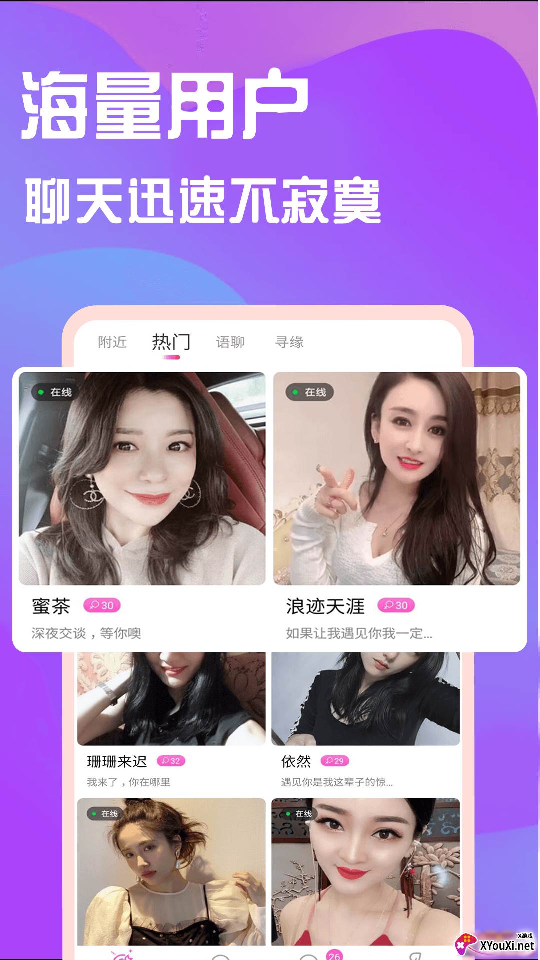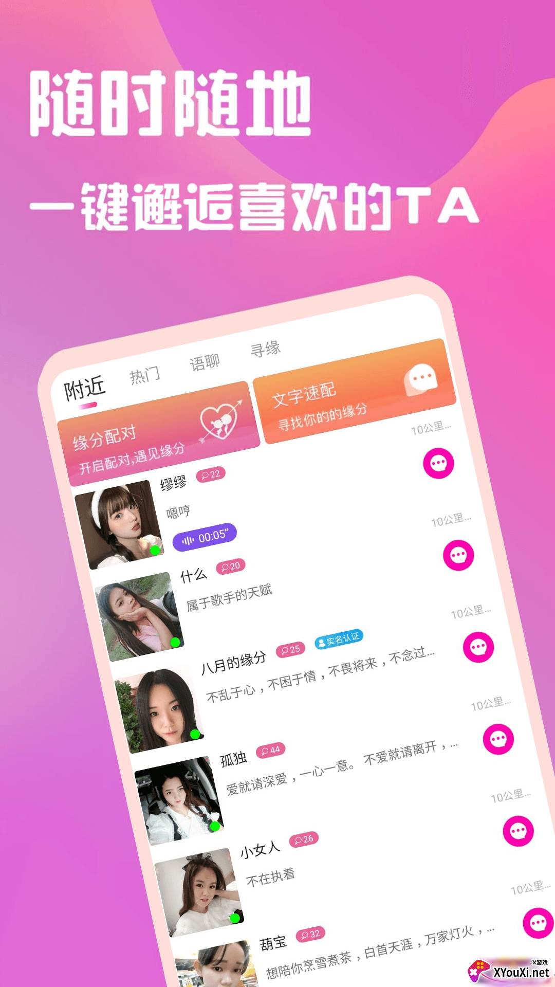 - 语音互动,声临其境: 告别枯燥的文字,用声音传递情感。一对一语音聊天,让你们的距离瞬间拉近。探寻附近单身女生的秘密,开启一场属于你和TA的约会。