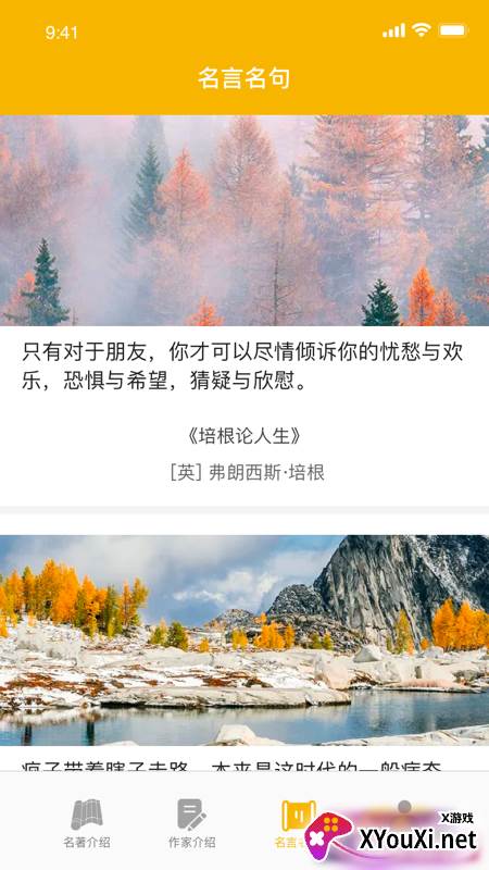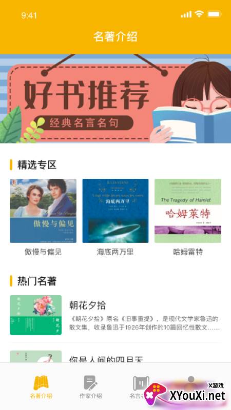 爱阅书香app,一款专为书籍爱好者打造的阅读利器。其精心策划的“精选专区”,每日为您奉上各类经典名著,并附有详尽的介绍与故事梗概,让您纵览文学瑰宝。此外,软件还收录了众多世界知名作家的小传及脍炙人口的名言警句,可谓书香四溢,智慧荟萃。诚邀您前往007游戏网下载体验。