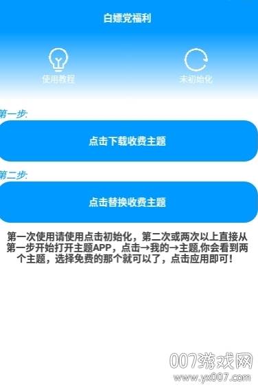 初次使用时,请先点击“初始化”。后续再次使用,直接从第一步开始,打开主题APP,进入“我的”→“主题”,您会看到两个主题选项,选择免费的那个并应用即可。
