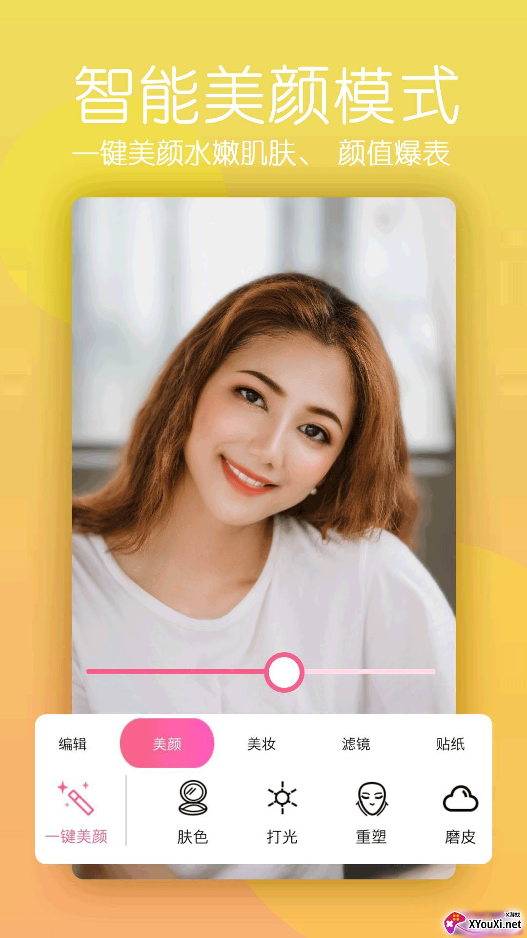 :只需轻轻一点,即可开启智能美颜模式,肌肤细腻柔滑,容颜光彩照人。
