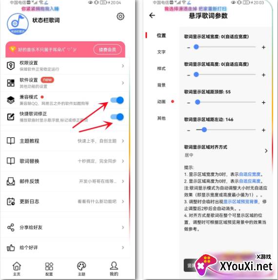 初次启动,请允许两项必要权限,并在系统设置中启用兼容模式。在此基础上,您便可随心所欲地调整悬浮歌词的各项参数,从显示效果到控制方式,尽在掌握。