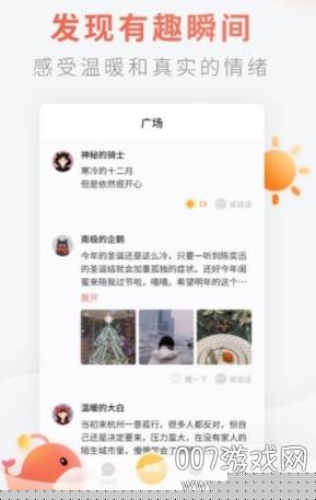 3、心情分享:随时随地发布你的生活点滴或内心感悟,吸引同好关注,分享喜怒哀乐。