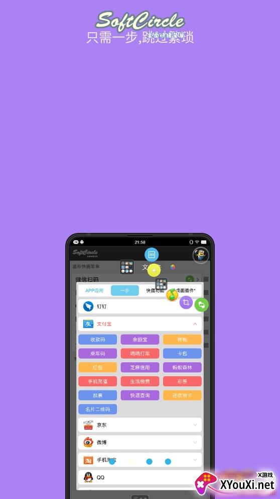 悬浮捷径SoftCircle快捷功能版,一款轻巧却功能卓著的手机快捷操作利器。它能将繁多的应用功能凝聚成小巧的悬浮菜单,用户可随心定制,无论是通勤乘车、惬意畅聊,抑或是便捷支付,都能瞬息直达,更能快速调出各类二维码。