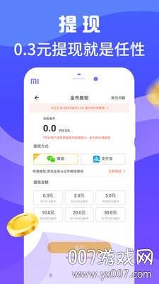 只需累积少量金币,即可启动提现。0.3元的超低门槛,让您随时随地将汗水转化为现金。无论是微信还是支付宝,提现方式随心选择,便捷高效。告别繁琐,享受即时到账的畅快体验,每一次提现明细都清晰可见,方便您随时查阅。