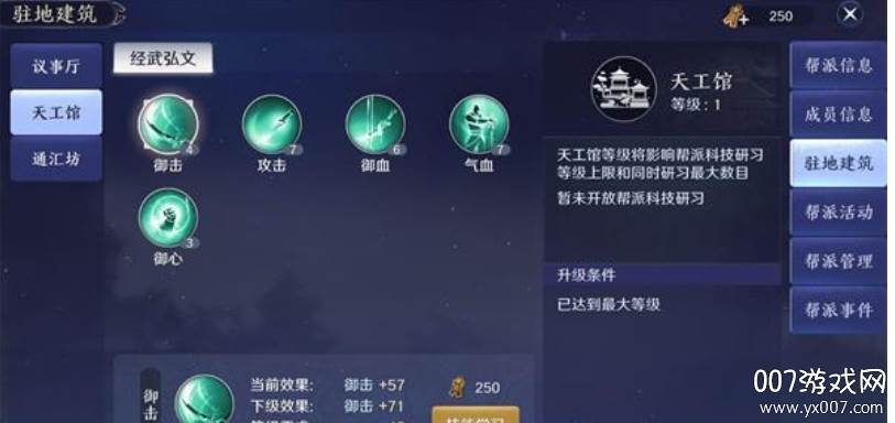 - 天工馆: 它的等级决定了帮派科技研习的上限以及同时进行研习的数量。