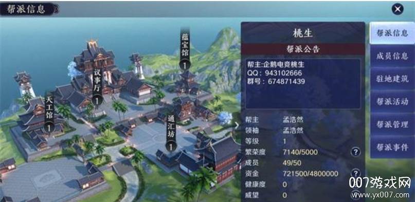 打开帮派界面,左侧是错落有致的帮派建筑,右侧是清晰明了的帮派信息。让我们一探究竟: