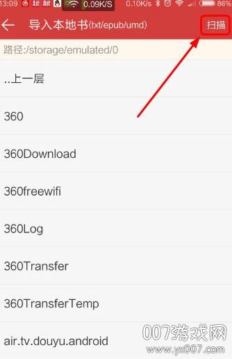 3. 您可以手动浏览文件夹找到您的本地书籍,或者点击右上角的“扫描”功能,让APP自动帮您搜寻。
