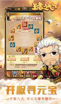 《王者之心(一元宝商城)》是一款融合三国经典与中国神话的挂机式回合手游。开局即送GM4特权,GM商城内海量珍稀道具仅需1元宝!玩家将扮演主公,招募三国名将,驯养上古神兽,征战四方,问鼎神话三国。这款特别定制的高福利版本,上线即赠海量元宝、绑元及各类装备材料,助您体验前所未有的畅快游戏之旅。