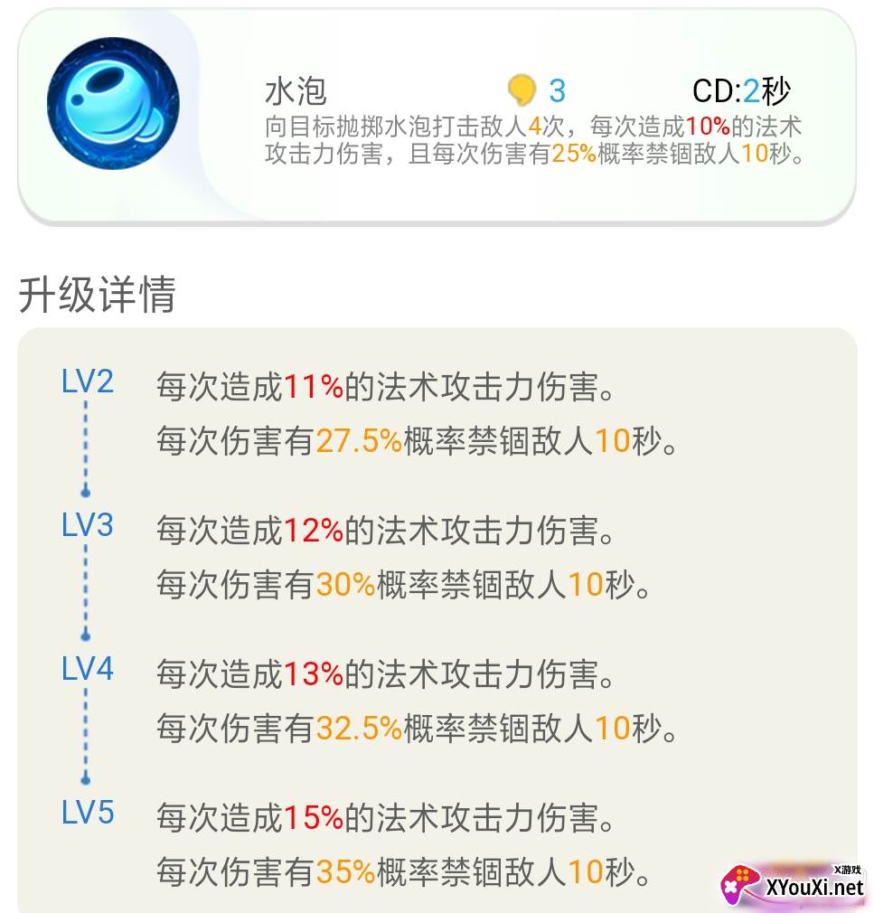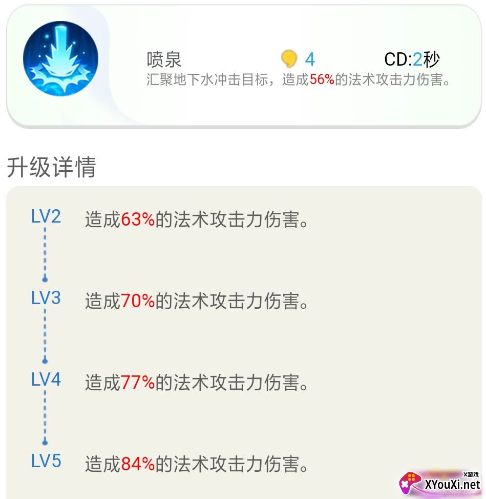 二技能:喷泉 (元气豆:4,CD:2秒)。汇聚水流冲击目标,造成56%法术攻击力伤害。虽然消耗元气豆较多且回气较慢,但在触发禁锢后,配合被动技能,能打出可观的爆发伤害。满级技能伤害可达84%,配合满级被动技能(60%增伤),总伤害可达144%。