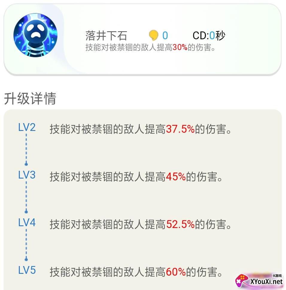 三技能:落井下石 (元气豆:0,CD:0秒)。对被禁锢的敌人,伤害提升30%。此技能是蛙护法的核心增伤被动,在一技能成功触发禁锢后,能显著提升后续技能的输出,尤其是在需要大量元气豆支撑爆发时,能最大化其作用。