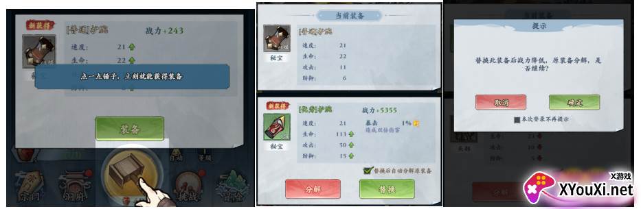 初入游戏,请务必跟随指引完成锻造,并为角色穿上初始装备。当出现新装备时,请留意图二的选项:勾选则意味着自动出售当前装备,方便你快速更新换代。若不慎点击到更高级的装备,游戏会弹出二次确认弹窗,让你谨慎选择是否出售或分解旧装备。
