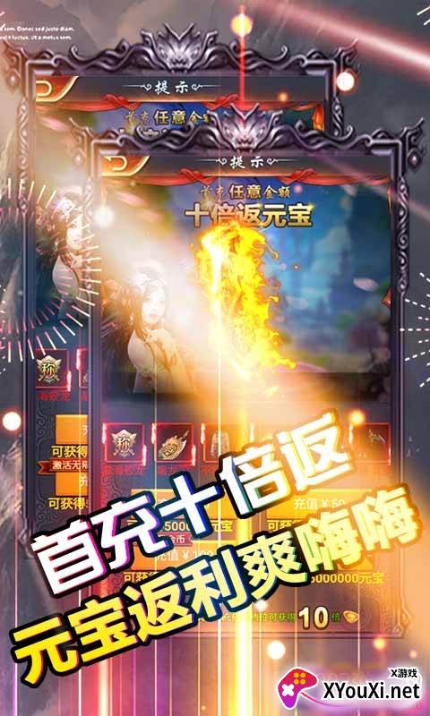 5. 充值比例高达1:5000,首充享10倍返利,续充更有机会获得最高10倍元宝奖励。