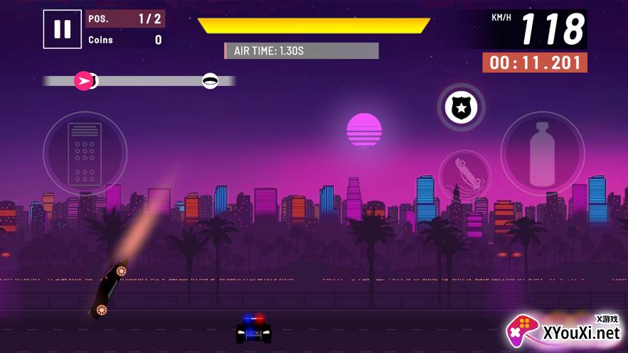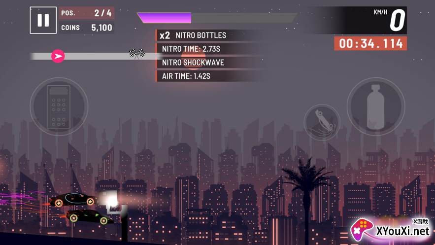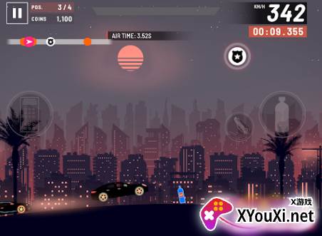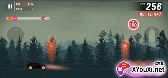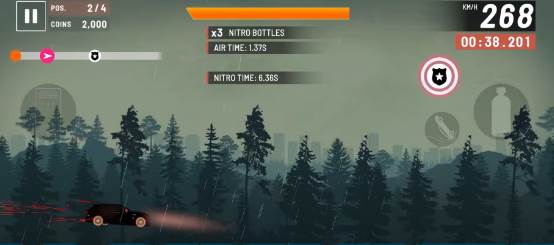 2、操作界面简洁明了:左侧区域掌控车辆的前进与制动,右侧按钮则用于激活加速道具。屏幕右上角实时显示你已驰骋的里程数。