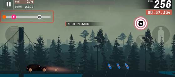 3、留意地图上的红色标记,它指示着你的当前位置。向着盾牌图标的方向前进,前方会有加速瓶道具等你拾取,助你一骑绝尘!