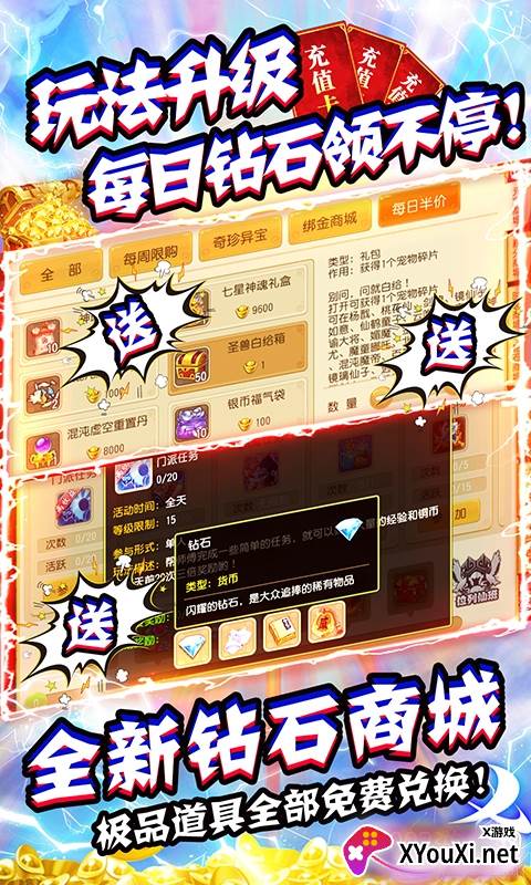 2. 门派任务全面升级,活跃任务即可获赠钻石,极品宠物、坐骑、翅膀、时装、材料应有尽有,平民玩家也能逆袭!