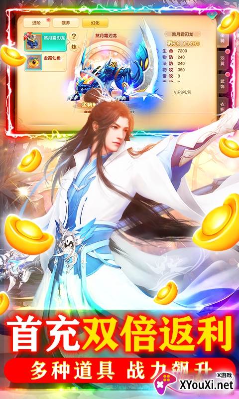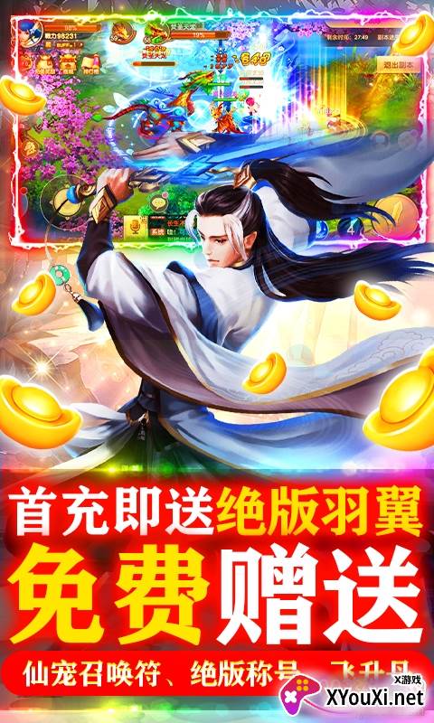 - 首充惊喜:首次充值即赠绝版羽翼、仙宠召唤符、绝版称号,更有等级飞升丹助您飞速升级,纵横六界。同时,首充双倍返利,更有三档充值选择!