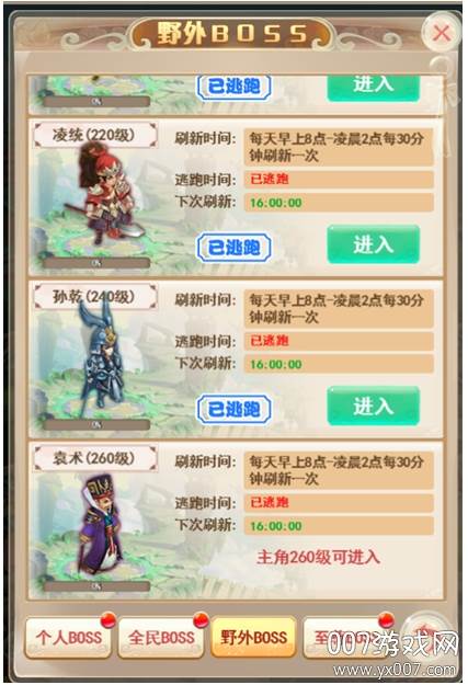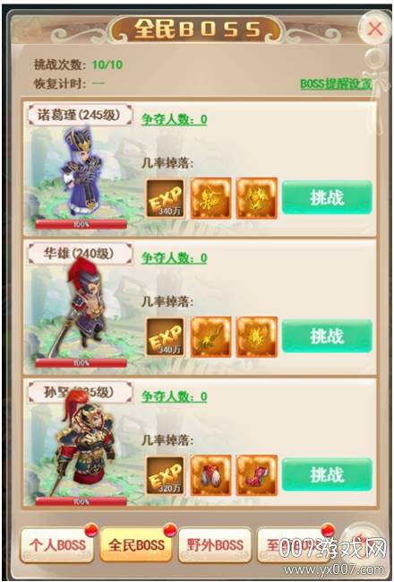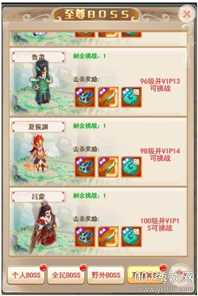 大家好!我是你们的小编,今天继续为大家带来《萌回三国》的精彩内容!本次我们要深入探讨的是游戏中的核心玩法之一——BOSS系统。只要主城等级达到30级,BOSS系统便会悄然开启,其中包含了个人BOSS、全民BOSS和野外BOSS三大类型。那么,它们究竟有何玄妙之处?让我们一探究竟!
