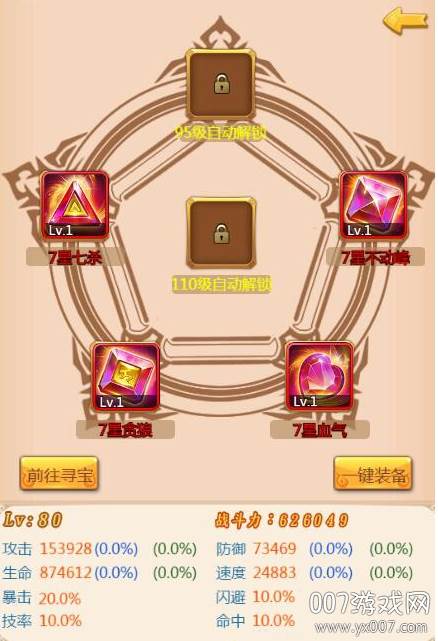 宝石:当玩家等级达到45级时,宝石系统便会解锁。随着等级的提升,可装备的宝石数量也将随之增加。其中,对战力提升最为显著的宝石被誉为稀有宝石,主要包括攻击宝石、防御宝石、速度宝石和生命宝石。宝石是可以升级的,等级越高,所带来的战力加成越可观;而七星宝石更是可以进行突破,突破后的战力飙升更是令人惊叹。宝石的获取途径多样,如寻宝、VIP礼包、幸运转盘、超级幸运转盘等。