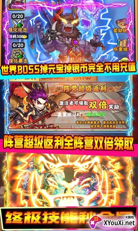 - 神将礼包(单日充值120元):周瑜*3、左慈*3、赵云*3、体力丹*10、百万银票*20