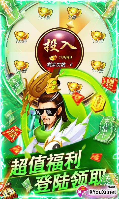 6. 各类超值礼包,海量福利放送,元宝拿到手软!在线即可领取神将夏侯惇,七日登录赠送龙胆银枪赵云,周卡奖励东吴火神周瑜,至尊卡每日无限元宝!