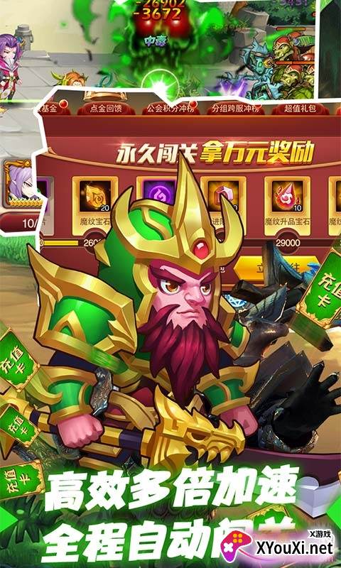 《魔兽三国送99000钻石版》是一款以三国为背景的卡牌策略手游。玩家登录游戏即可获赠198元充值卡、满级VIP特权,并享有海量钻石与金币,资源充沛,取之不尽!更有“欧皇无限爽抽”活动,让你轻松赢取充值卡,搭配高效多倍加速与全程自动闯关功能,游戏体验直线飙升!