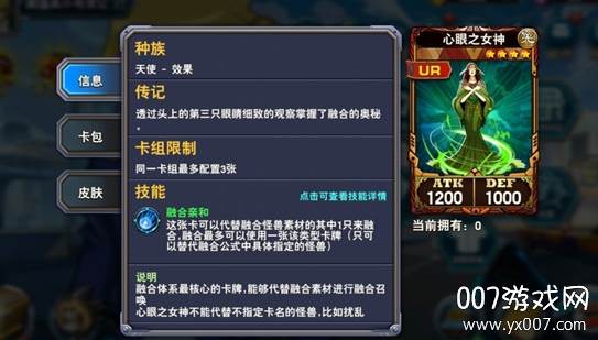 对于经常使用白龙融合的玩家而言,“末日龙”的取舍是一个令人头疼的问题。作为龙王的素材,许多玩家将其纳入卡组以召唤龙王。然而,现实往往是,当你试图用“假面龙”撞击对手以召唤“白石”并获取“白龙”时,却意外地出现了“末日龙”;或者在你手牌缺乏“支配者”和“融合”时,“末日龙”却出现了;亦或是在你渴望神抽时,抽到的却是“末日龙”!请大家明白一点,龙王并非我们制胜的绝对保障。我们之所以追求龙王,是为了最终召唤出我们的核心——青眼白龙!在1600分以上的天梯环境中,龙王极易被解,除非你第一回合就获得“天胡”开局,否则一旦召唤出来,往往会被迅速处理。龙王的身板过于脆弱,而融合的机制会让你损失三张卡。一旦龙王被解,游戏基本就宣告结束了。因此,在被“末日龙”这张卡折磨了无数次之后,我决定放弃它,转而选择了另一张卡——“心眼之女神”。