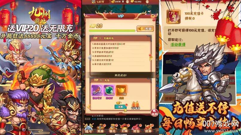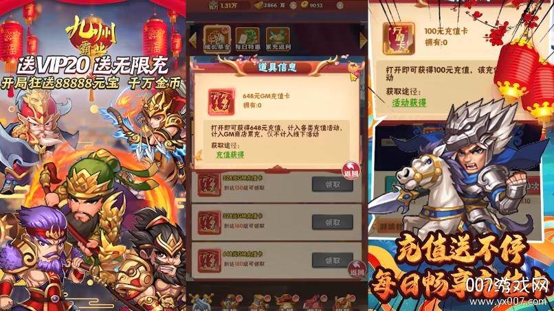 1. 登录即享VIP20尊贵身份,海量元宝(88888)与金币(1000万)伴你启程。充值比例高达1:1000,首充更有三倍惊喜,更有强力武圣关羽免费相赠!